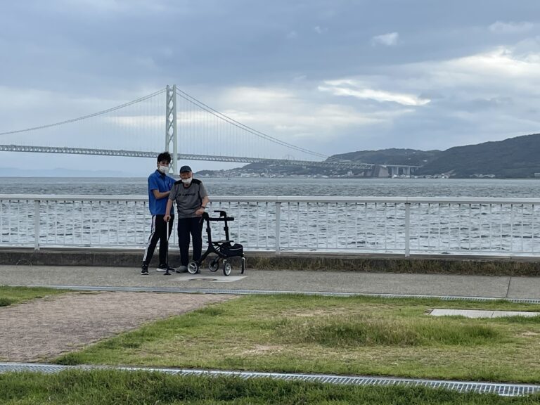 明石海峡大橋を背景に歩行練習を!!